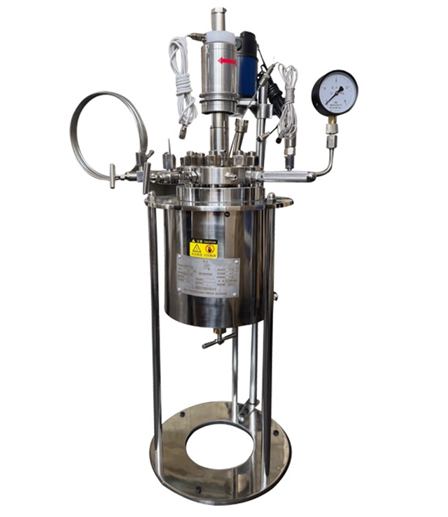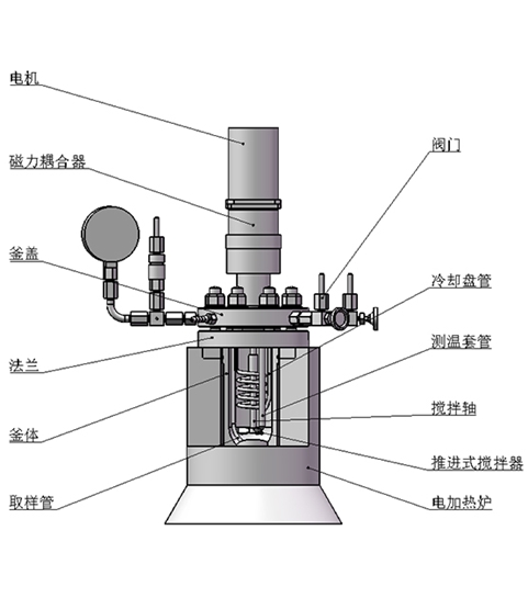 該結(jié)構(gòu)為端面磁力密封裝置,依靠兩塊強(qiáng)力磁鋼異極相吸的原理通過磁場穿透密封罩體來實(shí)現(xiàn)力矩的無接觸式傳遞,由于電機(jī)直接帶動(dòng)攪拌器,故而其攪拌特點(diǎn)是低轉(zhuǎn)矩高轉(zhuǎn)速(≤1500r/min),適合攪拌低粘度(cp≤2000mpa.s)或固體顆粒物含量較少的反應(yīng)物料介質(zhì)體系。